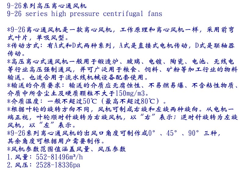 高壓離心式通風機一般用于鍛造爐、玻璃、電鍍、陶瓷、電池、無線電等行業高壓強制通風,并可廣泛用于糧食、飼料、礦粉等加工行業的物料輸送。
